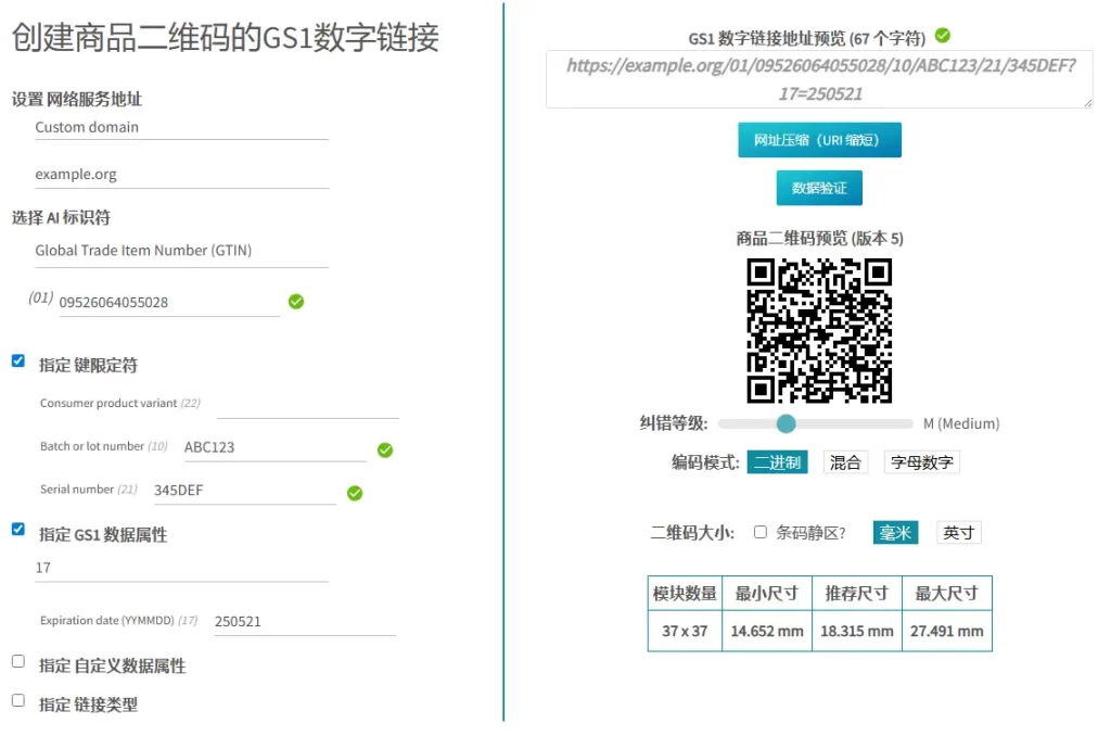 | 快消零售 | GS1数字链接URI语法(QR Code) | GTIN(01)+消费者产品变体(22)+批次号(10) | 元气森林扫码领券、宝洁产品成分查询(示例:https://example.com/01/09526064055028/22/001/10/ABC123 ) |