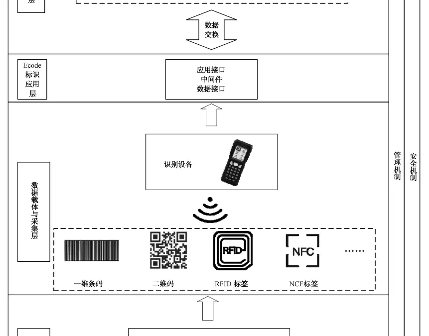 - 数据载体与采集层(中间支撑):负责 Ecode 的存储与读取,载体包括一维条码、二维码、RFID 标签、NFC 标签,采集需使用对应的自动识别工具;