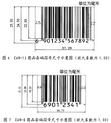 EAN/UPC条码符号的放大系数一般在0.80~2.00的范围内选择。条码符号随放大系数的变化而放大或缩小。具体尺寸要求见GB 12904-2003。当放大系数为1.00时,EAN-13与EAN-8商品条码的主要尺寸如图6、图7所示。